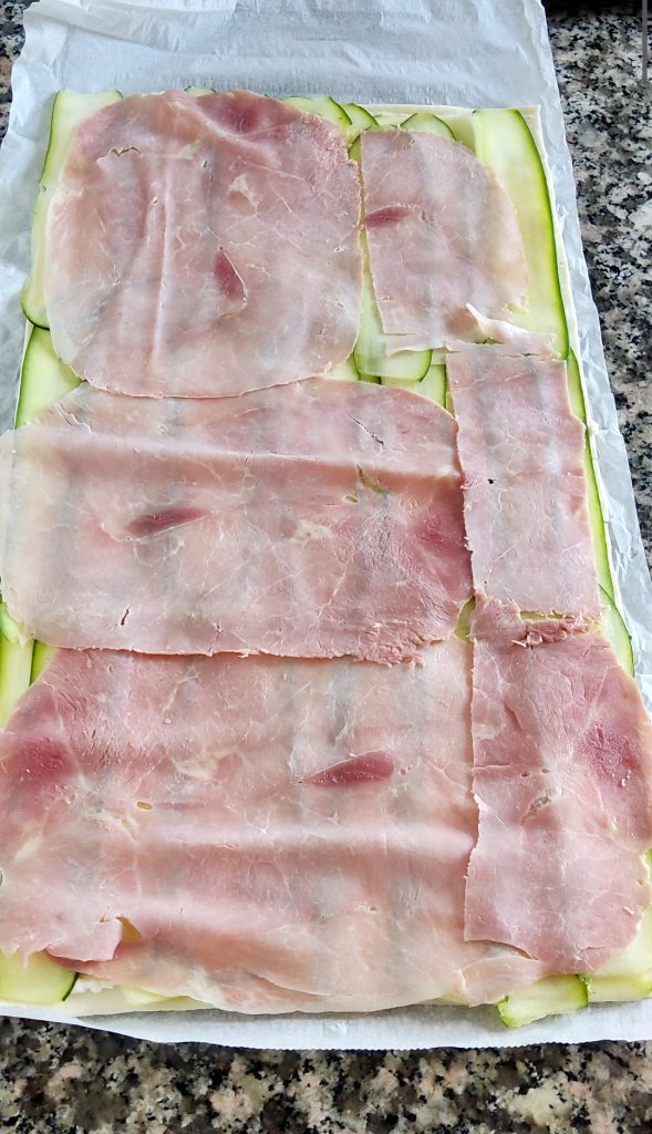 Bedek met de courgetteplakjes zodat het hele oppervlak bedekt is, de plakjes iets overlappend.