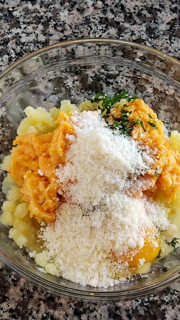 Voeg een snufje zout, een ei, de fijngehakte peterselie en geraspte parmezaan toe. Meng en voeg ten slotte het paneermeel toe, meng goed om een zacht maar niet plakkerig deeg te krijgen, voeg indien nodig meer paneermeel toe.