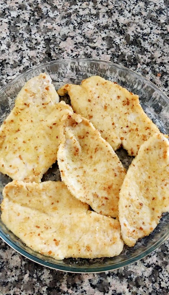 Voor dit recept heb je dunne plakjes kipfilet nodig. Indien nodig sla ze nog dunner met een vleeshamer. Haal de kipfilets rondom door het paneermeel