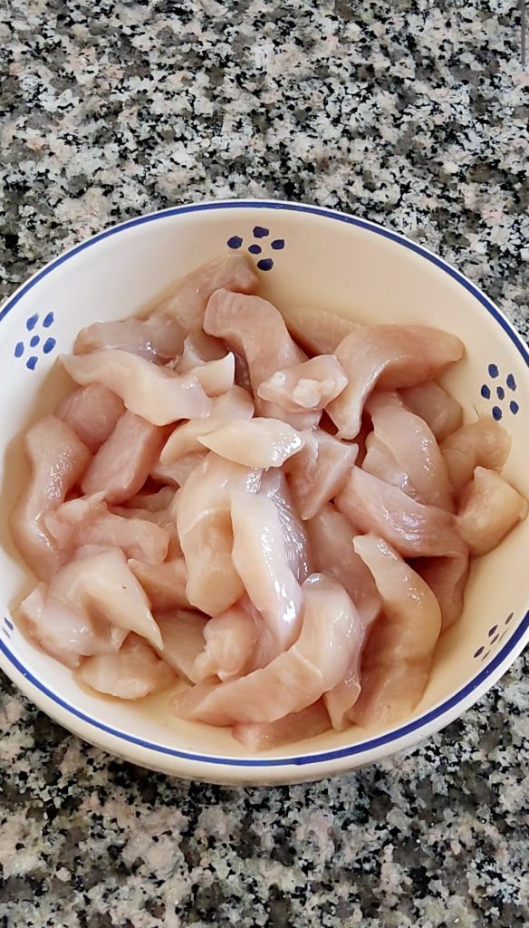 Snijd de kipfilet in reepjes of stukjes. Doe ze in een kom en strooi er de bloem over. Meng goed zodat de kip overal wordt bebloemd.