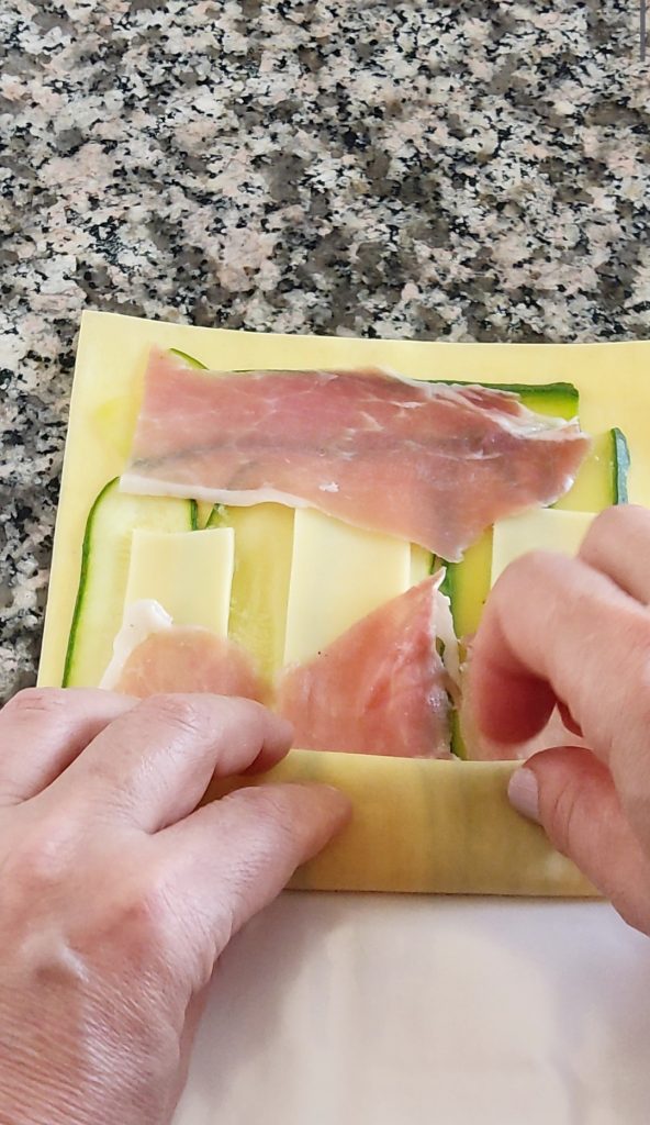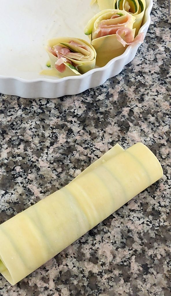 Lasagnerolletjes met courgette en spek gebakken in de oven. Het recept dat ik jullie vandaag wil vertellen, is dat van een smakelijke en hartige gevulde ovenschotel. Met kant-en-klare verse lasagnevellen heb ik bladerdeegrolletjes gemaakt en deze gevuld met plakjes courgette, plakjes spek, kaas en romige bechamelsaus. Als je de bechamelsaus van tevoren bereidt, of voor gemak, de kant-en-klare versie gebruikt, is dit recept ook eenvoudig te maken. Ik heb de courgette in zeer dunne plakjes gesneden met behulp van een dunschiller en om ze zachter te maken heb ik ze slechts enkele minuten geblancheerd in water. Vergeet ook niet het recept van de gevulde lasagnebundeltjes en het recept van de gevulde courgettepannenkoeken. Laten we dan naar de keuken gaan en samen onweerstaanbare pastarolletjes met courgette bereiden