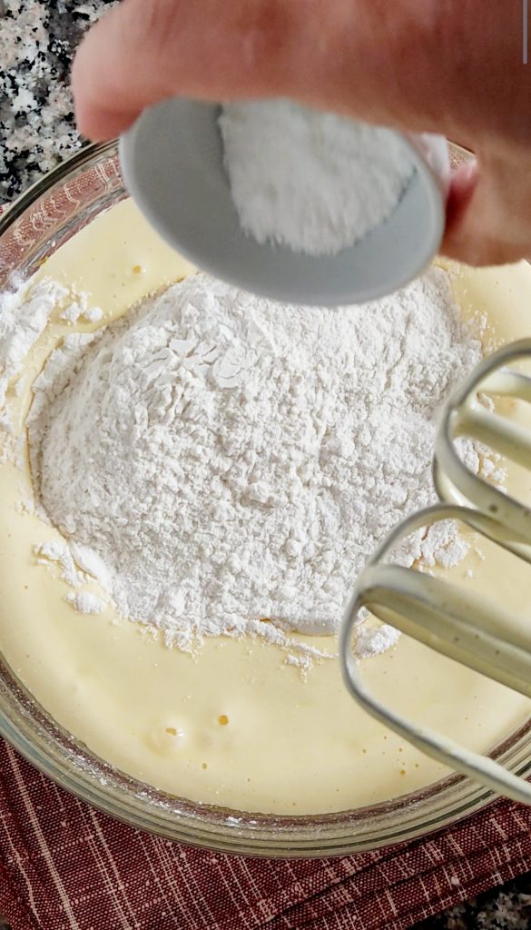 Voeg de gezeefde bloem, het bakpoeder en de kaneel toe. Meng.