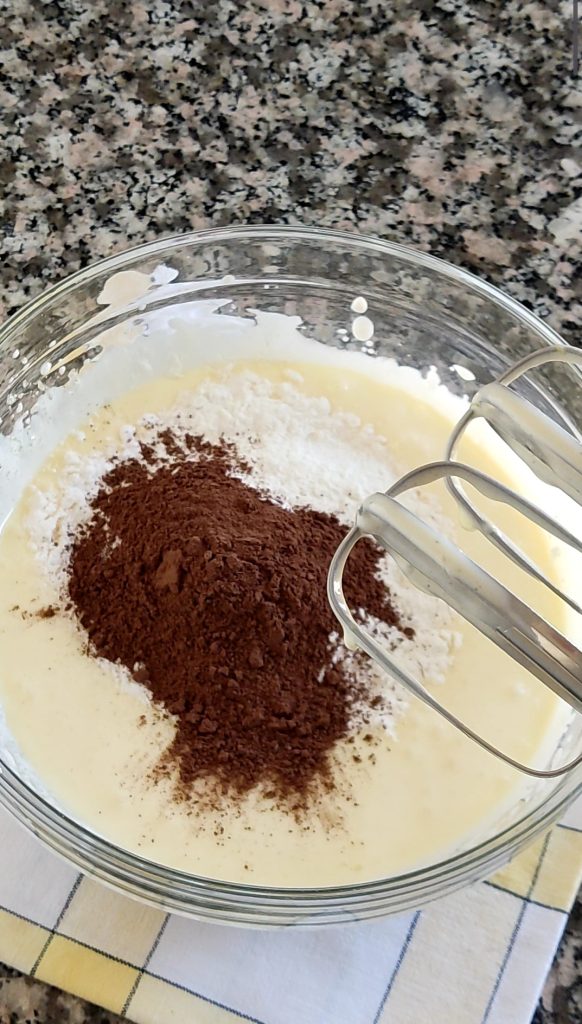 Ga verder met de bereiding door de gezeefde bloem, het bakpoeder en de cacaopoeder toe te voegen. Meng goed.