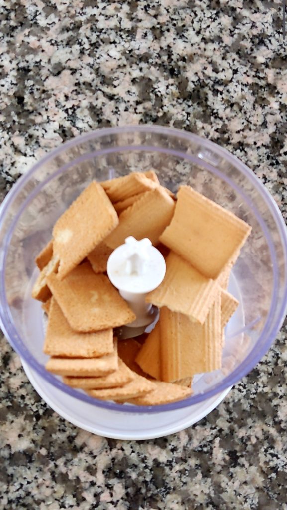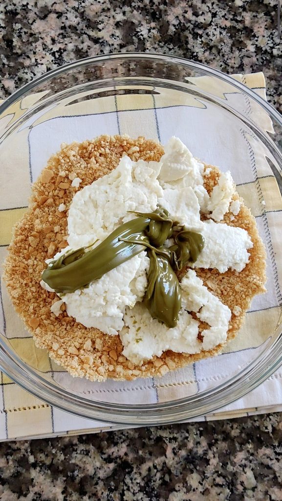 Maal de chocolade koekjes in een mixer. Als je graag een paar stukjes knapperige koekjes proeft, maal ze dan niet te fijn. Doe ze in een kom en voeg de mascarpone en de pistachecrème toe.