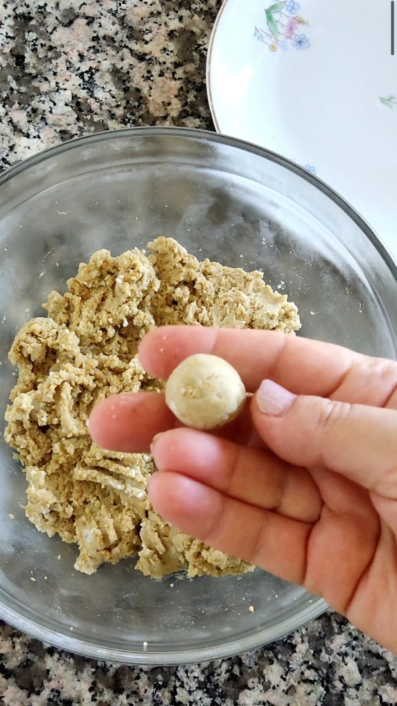 Meng goed met een spatel of gewoon met een vork. Neem kleine porties van het mengsel en rol ze tussen je handen tot kleine balletjes.