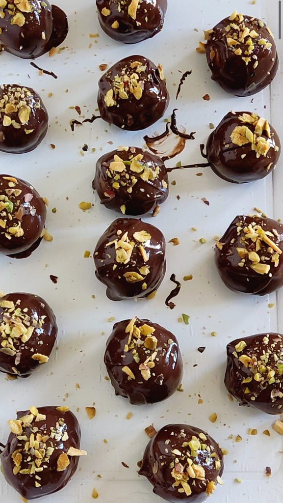 Doop één voor één de Pistache bonbons in de gesmolten chocolade en met behulp van 2 theelepels haal je ze eruit en leg je ze op een dienblad bekleed met aluminiumfolie of bakpapier.