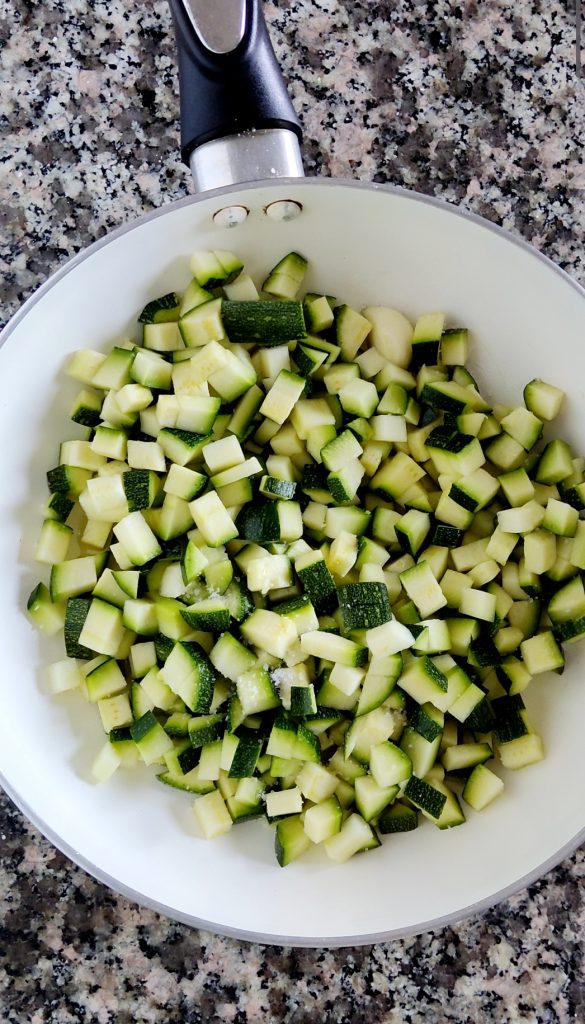 Was de courgettes. Snijd de uiteinden eraf en snijd ze in kleine blokjes. Giet de olijfolie in een pan, voeg een teentje knoflook en de courgettes toe.