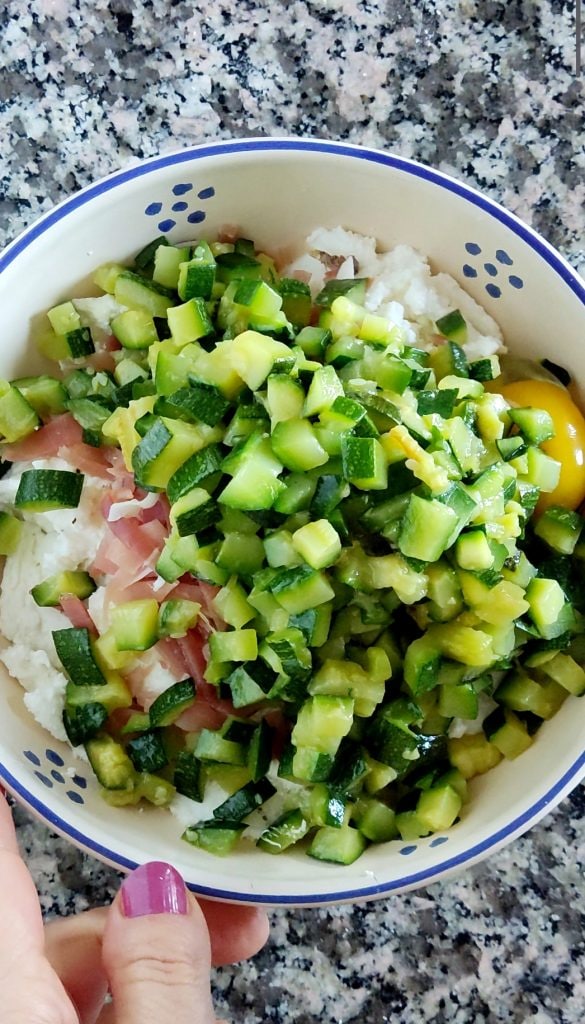 Voeg ook een ei en de courgettes toe. Meng het mengsel goed met een vork.