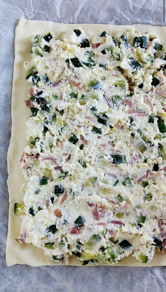 Rol een rol rechthoekig bladerdeeg uit op het werkblad. Bedek de helft van het bladerdeeg met het mengsel van ricotta en courgettes, verdeel het goed met de achterkant van een lepel of een spatel.