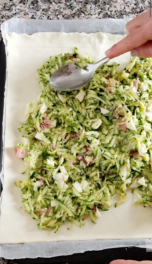 Mix alles goed door. Bekleed een rechthoekige bakvorm van 33 x 25 cm met bakpapier en een rol rechthoekig bladerdeeg.