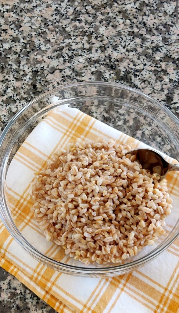 Voor snellere bereiding leg ik de spelt eerst 2 uur in een kom met water. Na de weektijd laten uitlekken en afspoelen onder stromend water. Laat het uitlekken. Kook de spelt in gezouten kokend water gedurende ongeveer 25 minuten.