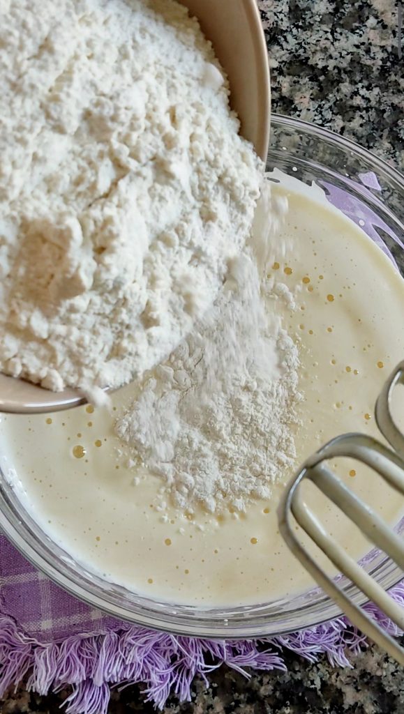 • Klop de 2 hele eieren met de suiker met behulp van een elektrische mixer gedurende ongeveer 8 minuten, totdat je een luchtig en schuimig mengsel hebt. Voeg de zonnebloemolie en een potje naturel yoghurt toe. Meng goed.
