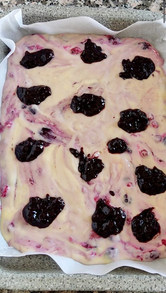 • Bekleed een rechthoekige bakvorm van 22 x 28 cm met bakpapier. Giet het mengsel in de vorm en verdeel het gelijkmatig met de spatel. Voeg met een theelepel veel hoopjes bosbessenjam over het hele oppervlak toe.