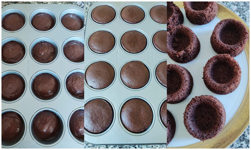 Voeg de gezeefde bloem, het ongezoete cacaopoeder en het bakpoeder toe. Meng tot een homogeen beslag. Vet een cupcakevorm in. Vul de holtes tot halfvol met het beslag. Met deze hoeveelheden kreeg ik 10 stukjes.