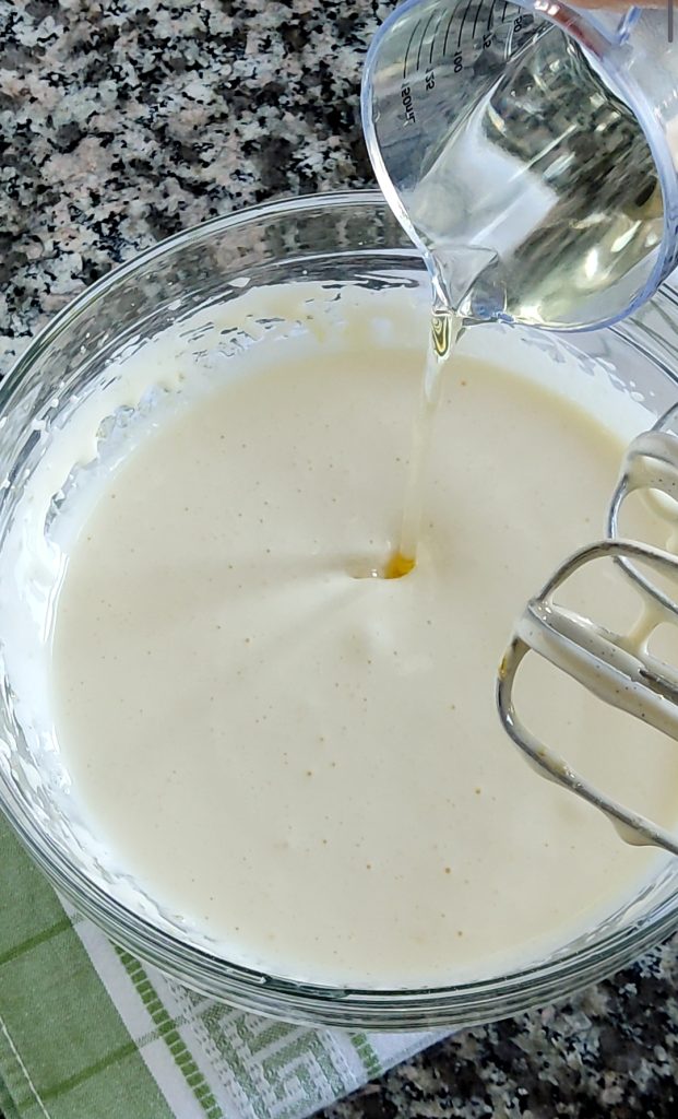 Voeg de zonnebloemolie en de melk toe. Meng.