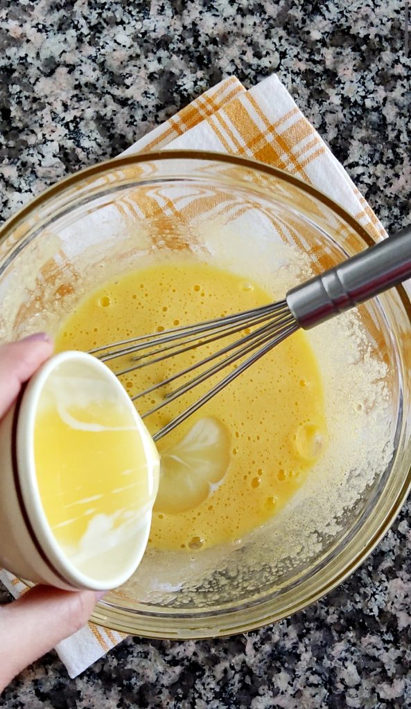 • Voeg de gesmolten boter toe en meng. Ga verder met de bereiding door de gezeefde bloem, het bakpoeder en de kaneel toe te voegen. Voeg ook de gehakte walnoten toe.