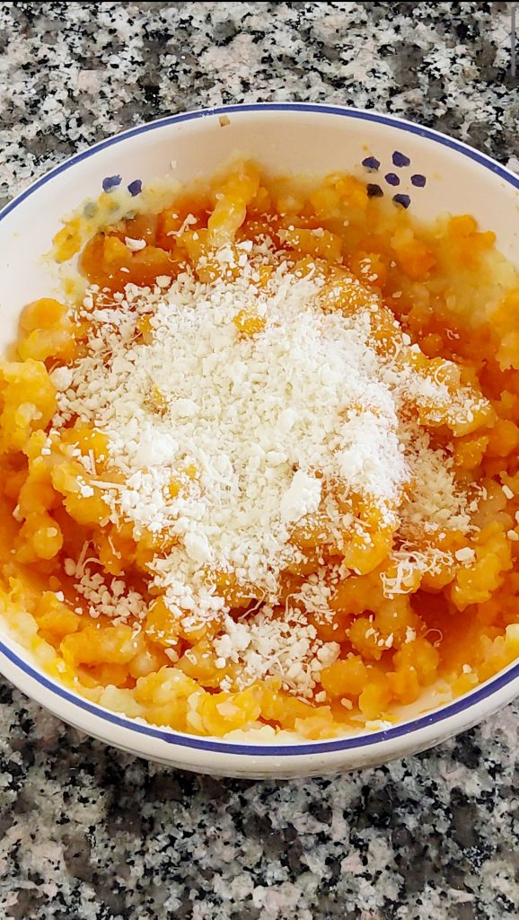 • Voeg de geraspte Parmezaan en een ei toe. Meng met een vork
