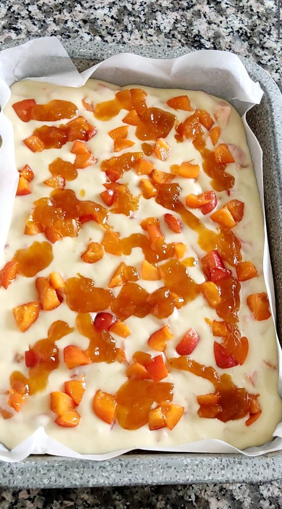 • Olie of bekleed een rechthoekige vorm met bakpapier. Mijn vorm is 21 x 28 cm. Giet het beslag erin en strijk het glad met de spatel. Verdeel de overige abrikozen in stukjes over de bovenkant.