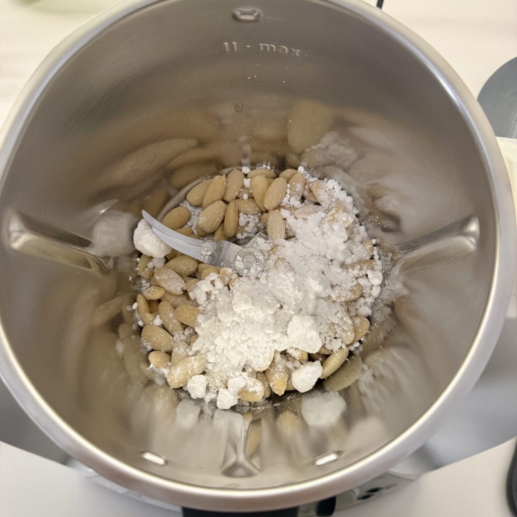 Laten we samen alle stappen bekijken om de amandelkoekjes te bereiden, zowel met als zonder de Bimby. De procedure is hetzelfde, of je nu de Bimby gebruikt of een gewone keukenmachine of hakmolen. Voor het gemak heb ik de Bimby gebruikt.