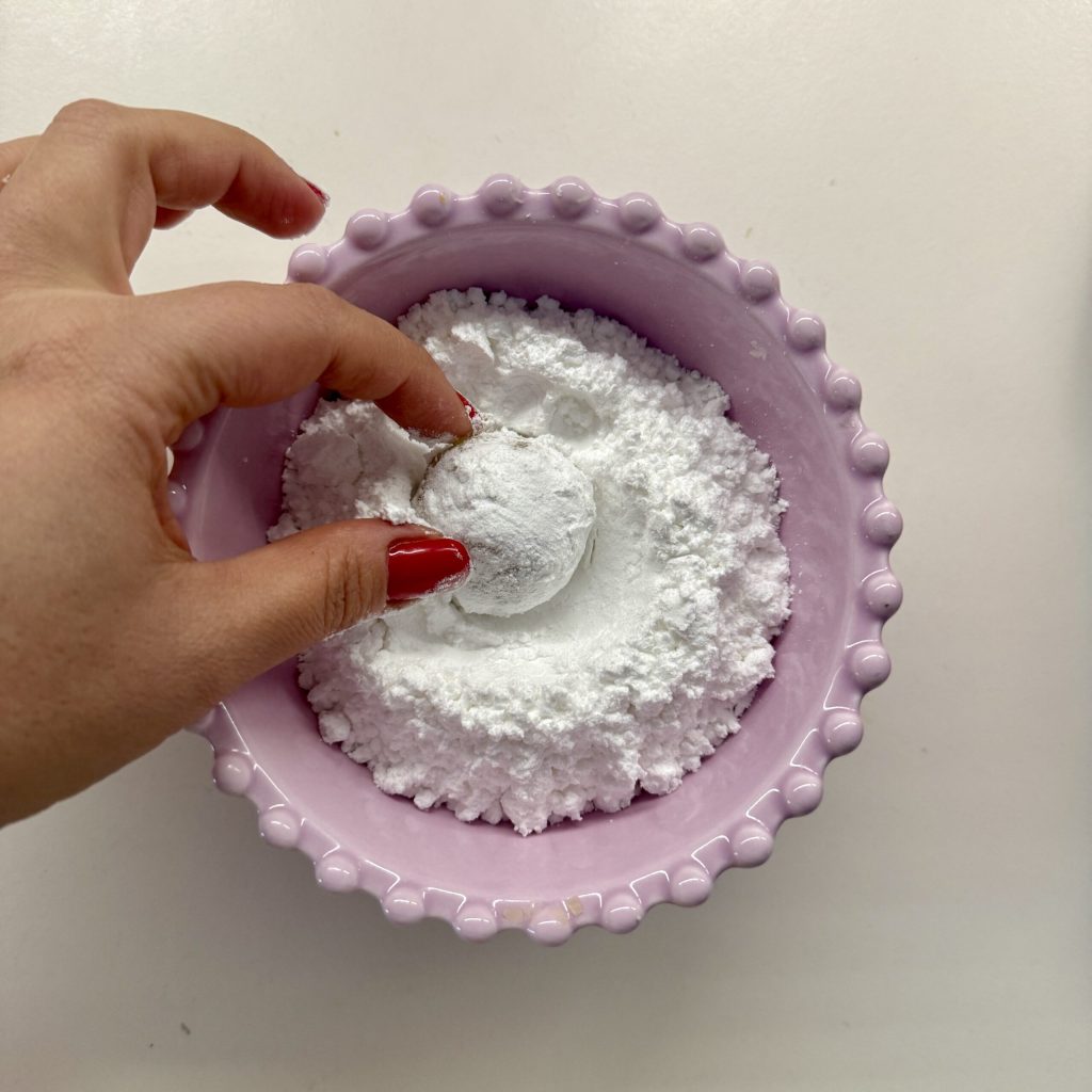 Om ze allemaal gelijk te maken, neem ongeveer 25 g deeg, maak een balletje en rol het door een kom waarin je poedersuiker hebt gedaan.