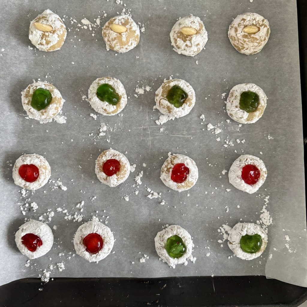 Leg ze op een bakplaat bedekt met bakpapier. Als je klaar bent met alle amandelkoekjes, versier ze dan met gekonfijte kersen en gepelde amandelen.
