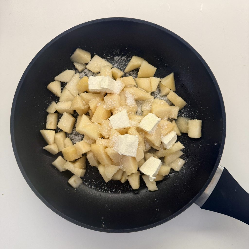 Snijd 2 peren in stukjes en doe ze in een koekenpan.