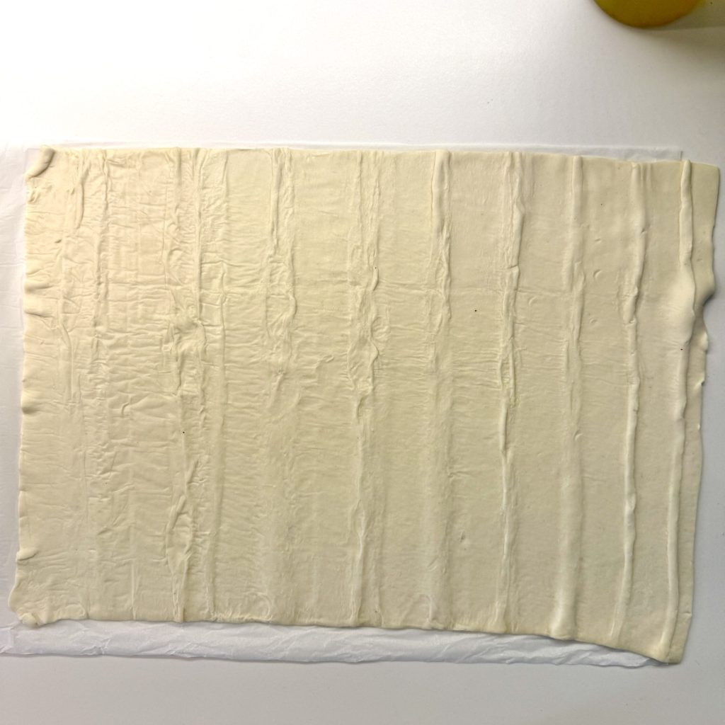 Haal de rol bladerdeeg uit de koelkast en rol hem uit op een werkvlak.