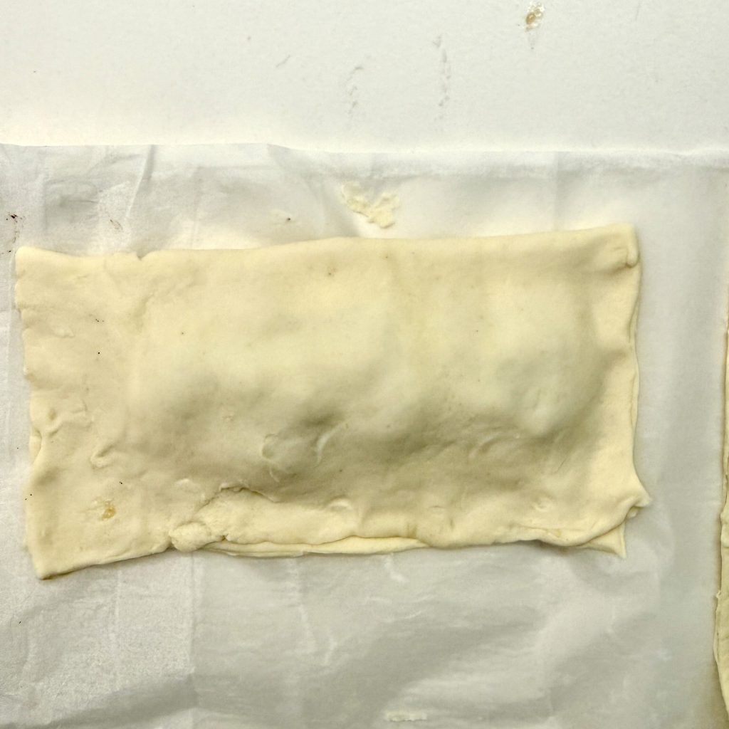Vouw de andere kant van het bladerdeeg over de vulling en vorm een pakketje. Druk de randen goed dicht en rol ze dan op zichzelf zodat er een kleine rand ontstaat.