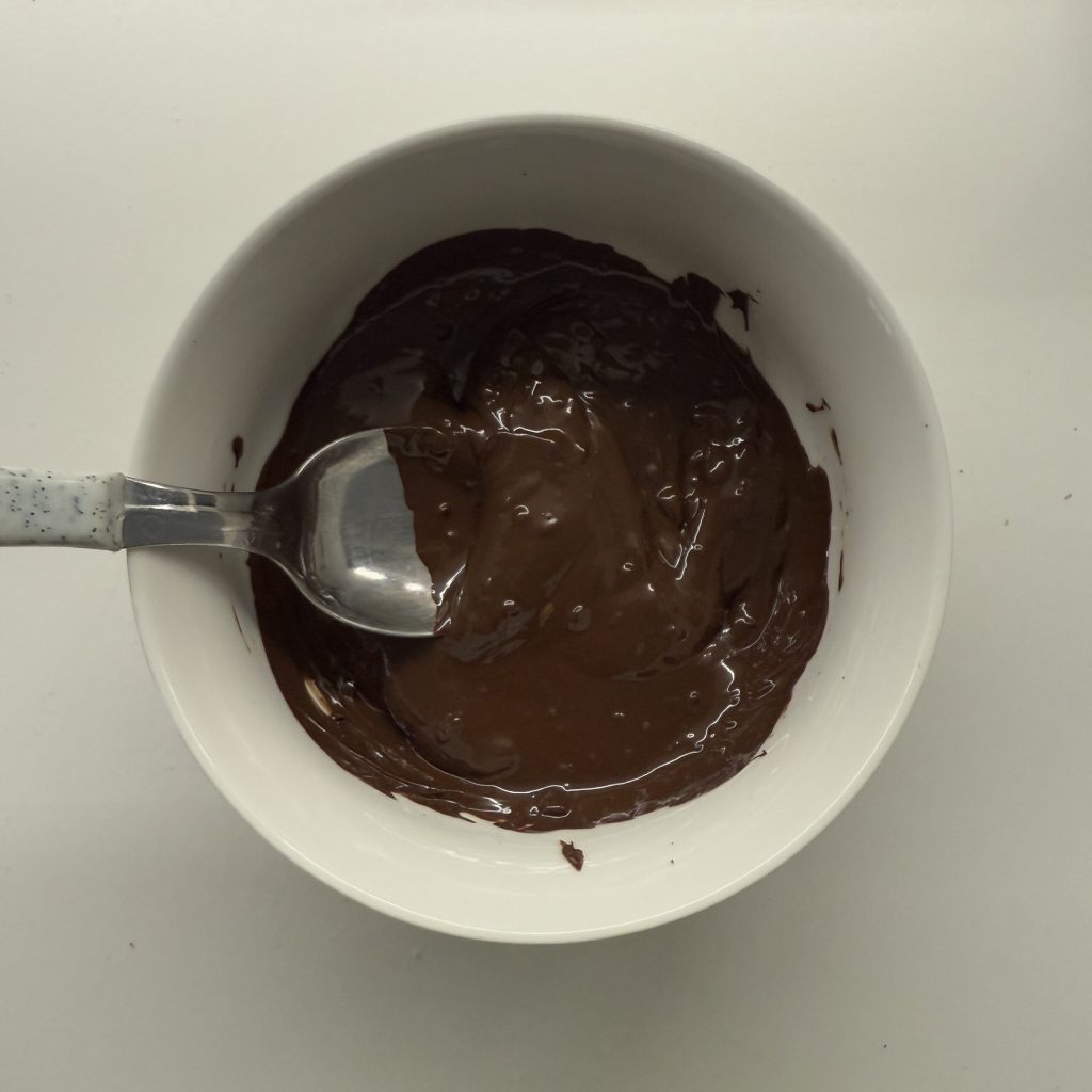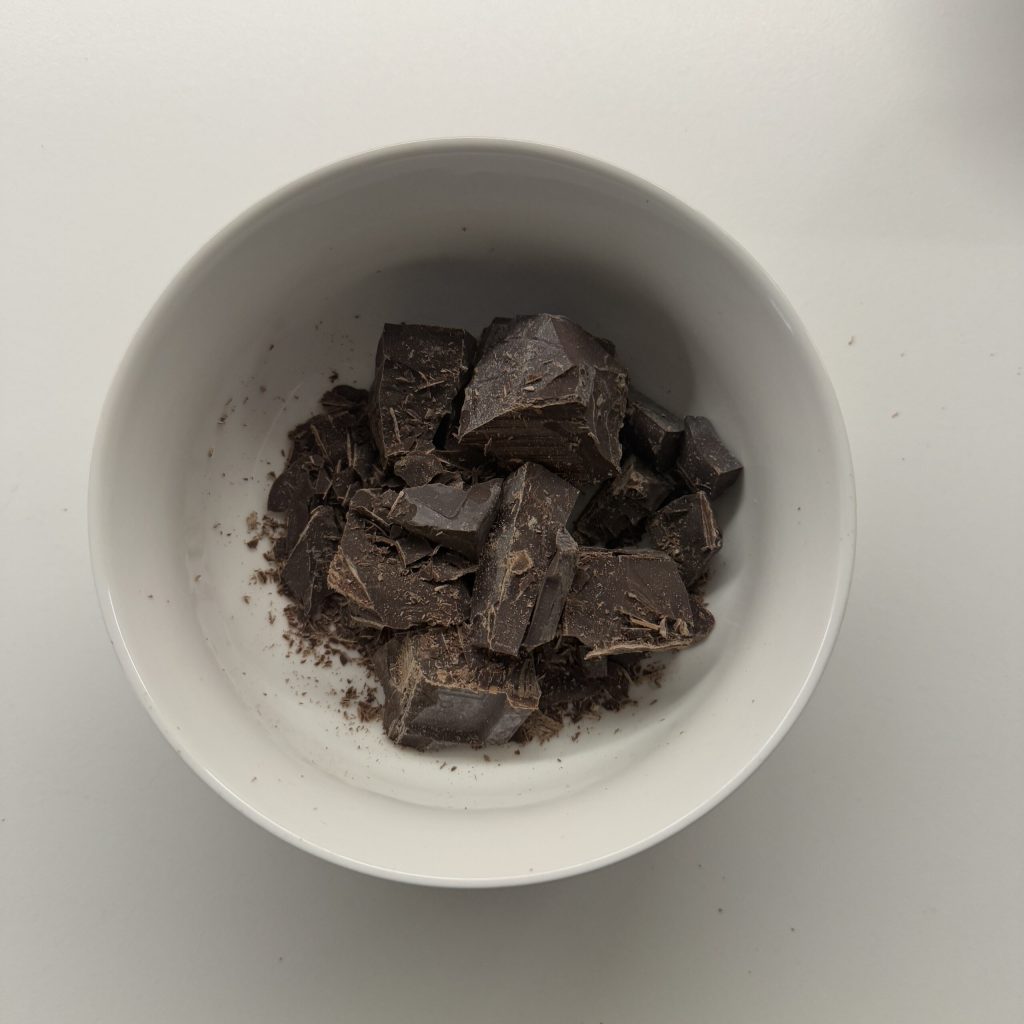Hak de pure chocolade grof met een mes, doe het in een kom en smelt het au bain-marie of in de magnetron.