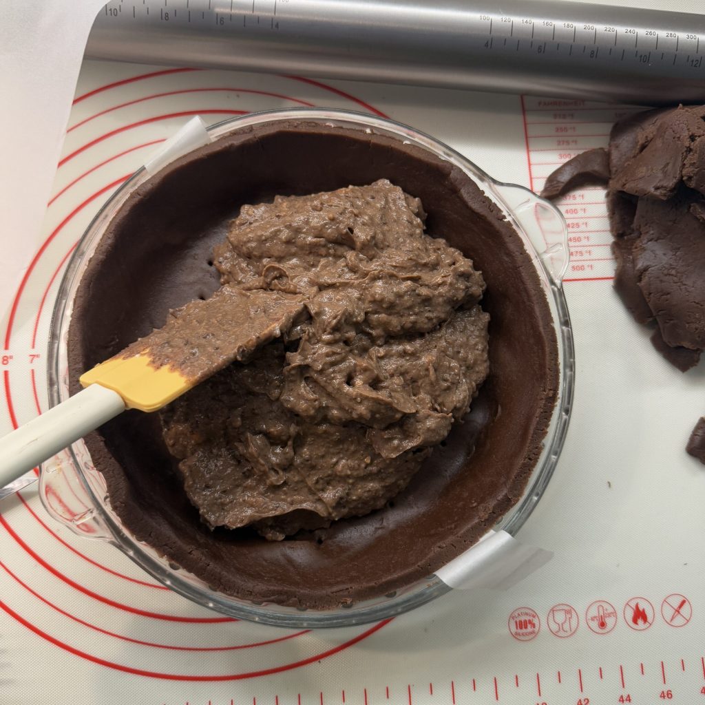 Verdeel de vulling met een spatel gelijkmatig over de taart en strijk het oppervlak glad.