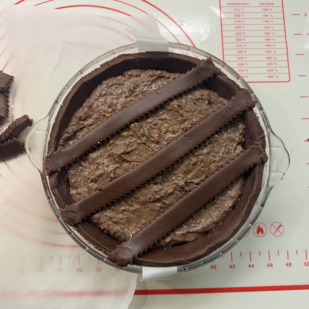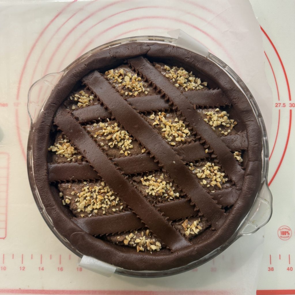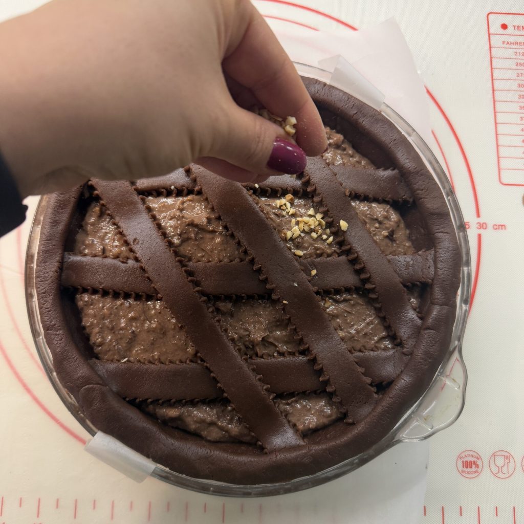 Ik heb deze taart gemaakt met een klassiek boterdeeg met cacao en voor de vulling heb ik ricotta, gesmolten pure chocolade, een van mijn favoriete ingrediënten voor desserts, gekozen, waaraan ik ook een paar eetlepels hazelnootpasta heb toegevoegd om het nog verleidelijker te maken.