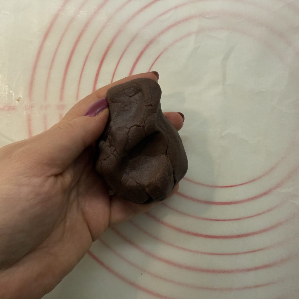 Zodra de ingrediënten gemengd zijn, maak je een gladde bal, wikkel je het in wat plasticfolie en laat je het cacao deeg minstens een uur in de koelkast rusten.