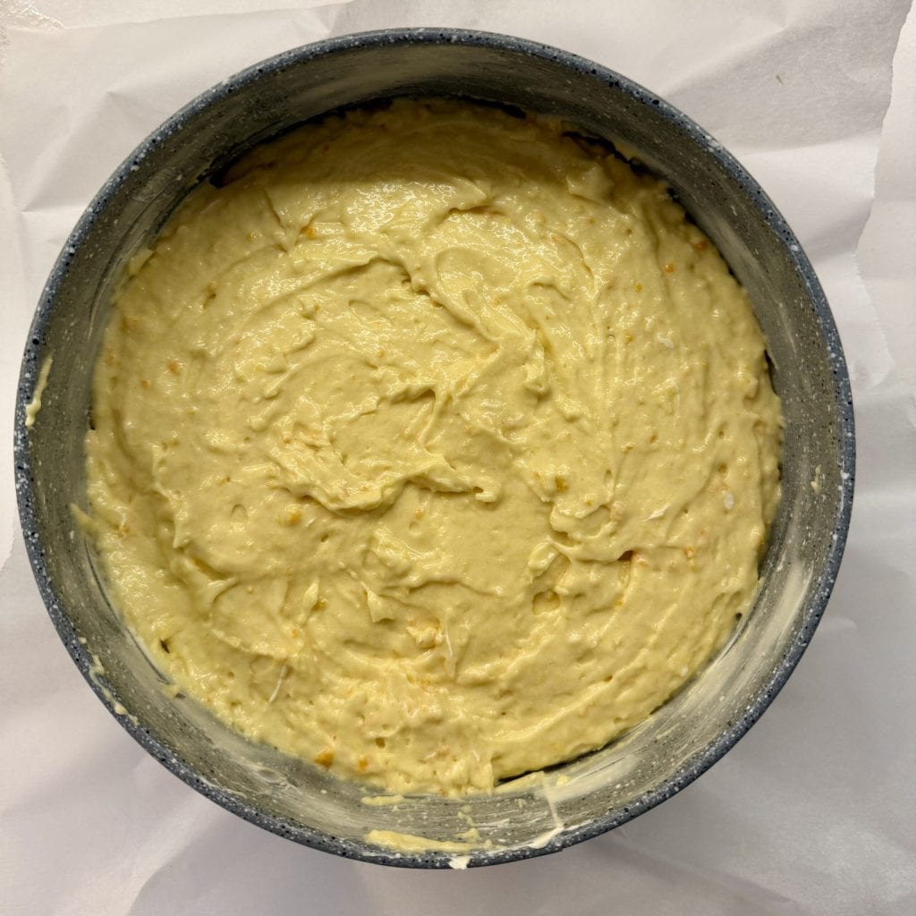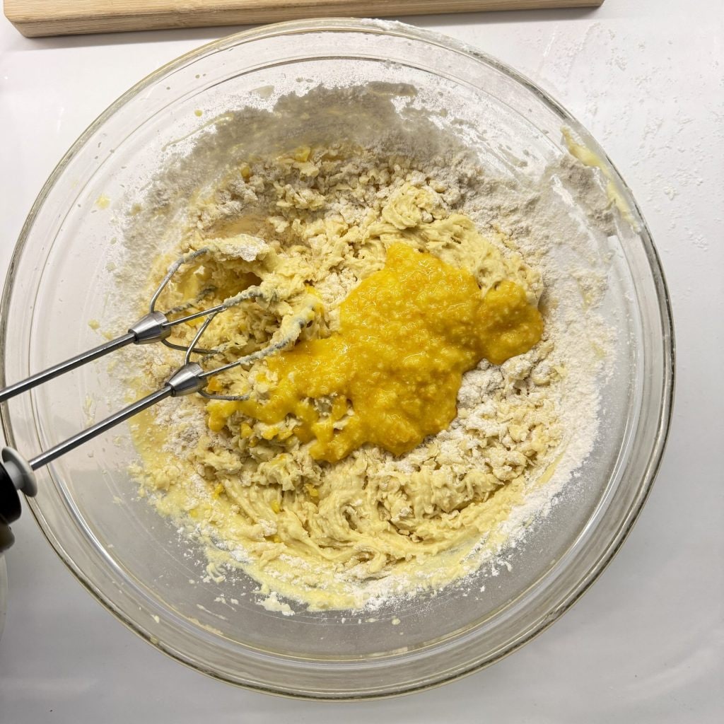 en voeg dan de rest van de clementinepuree en de rest van de bloem toe.
