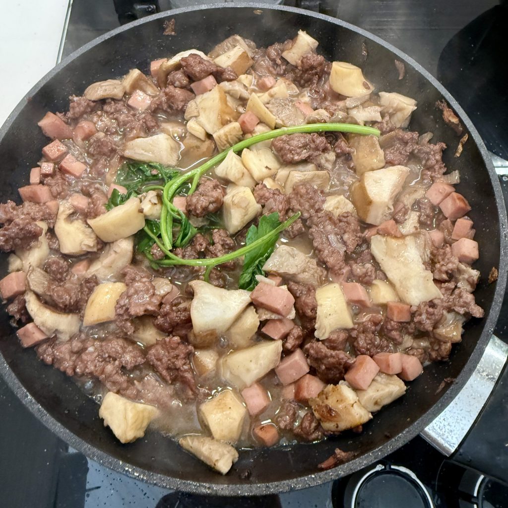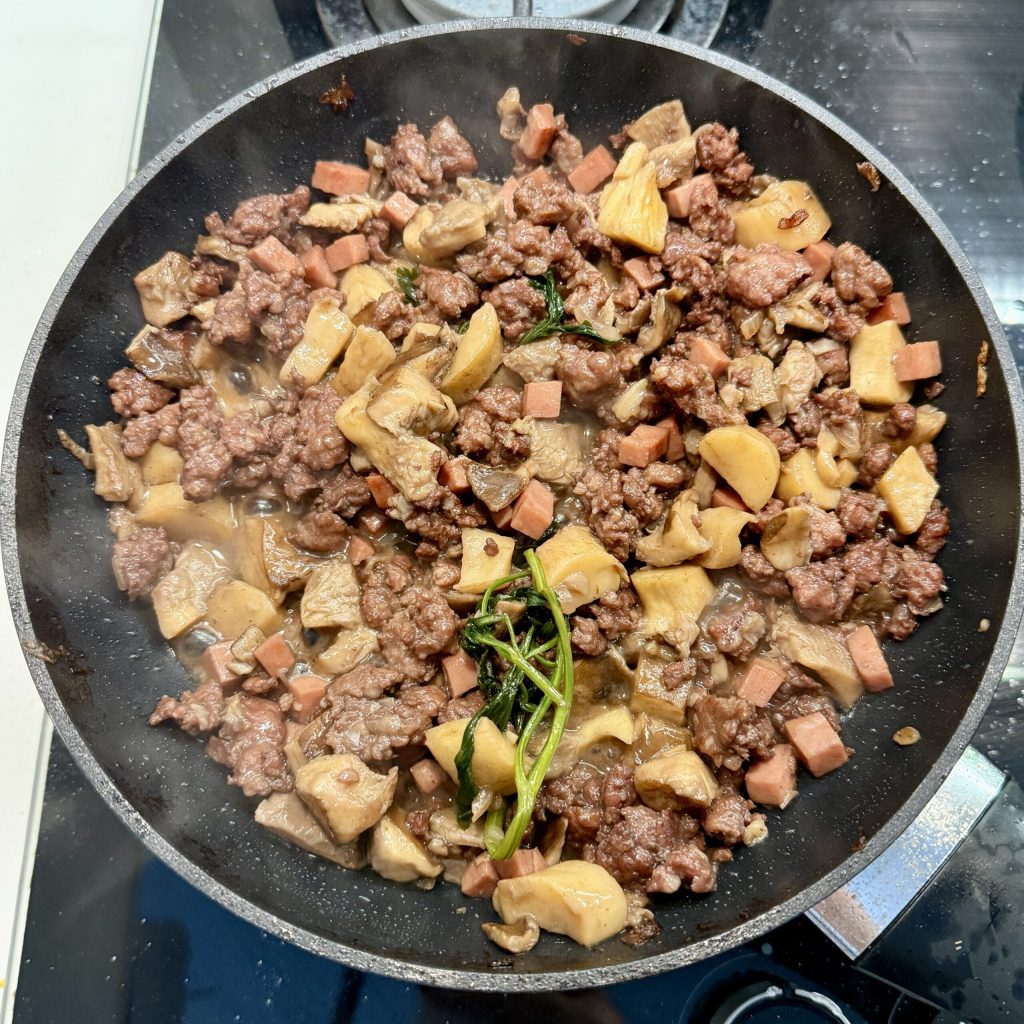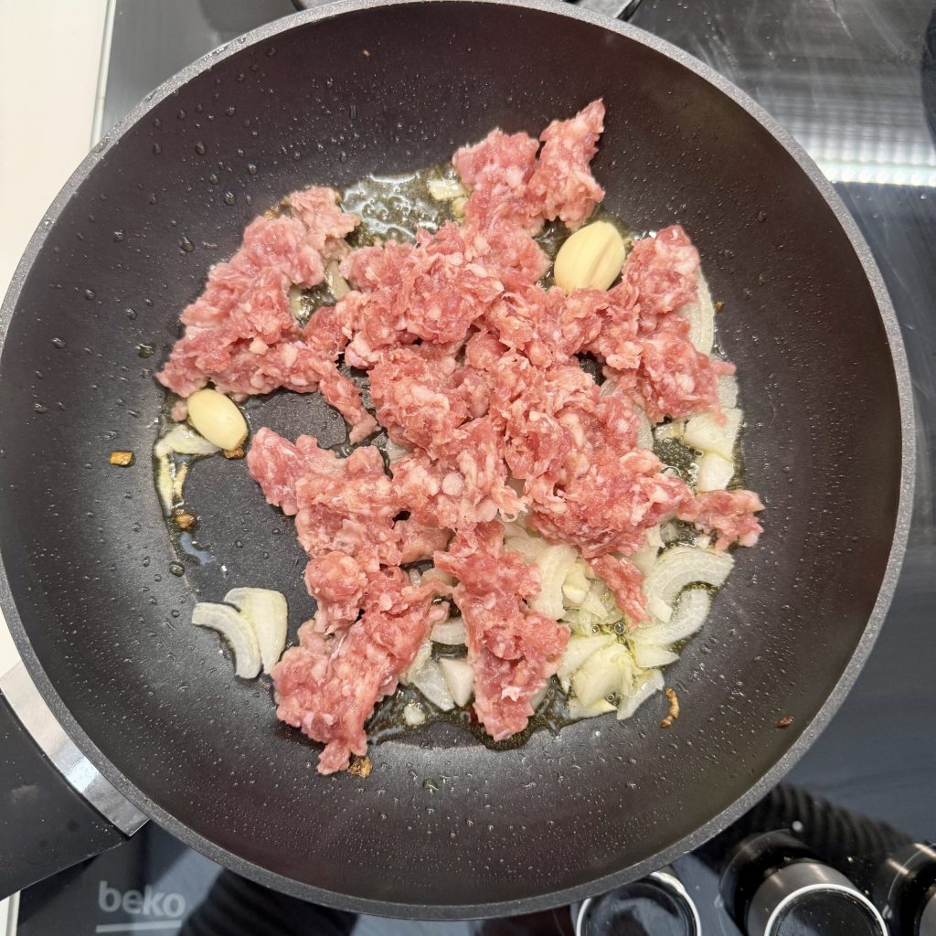 Zet het vuur op middelhoog en kook gedurende 4-5 minuten. Roer af en toe met een houten lepel en probeer de worst nog beter te verkruimelen.