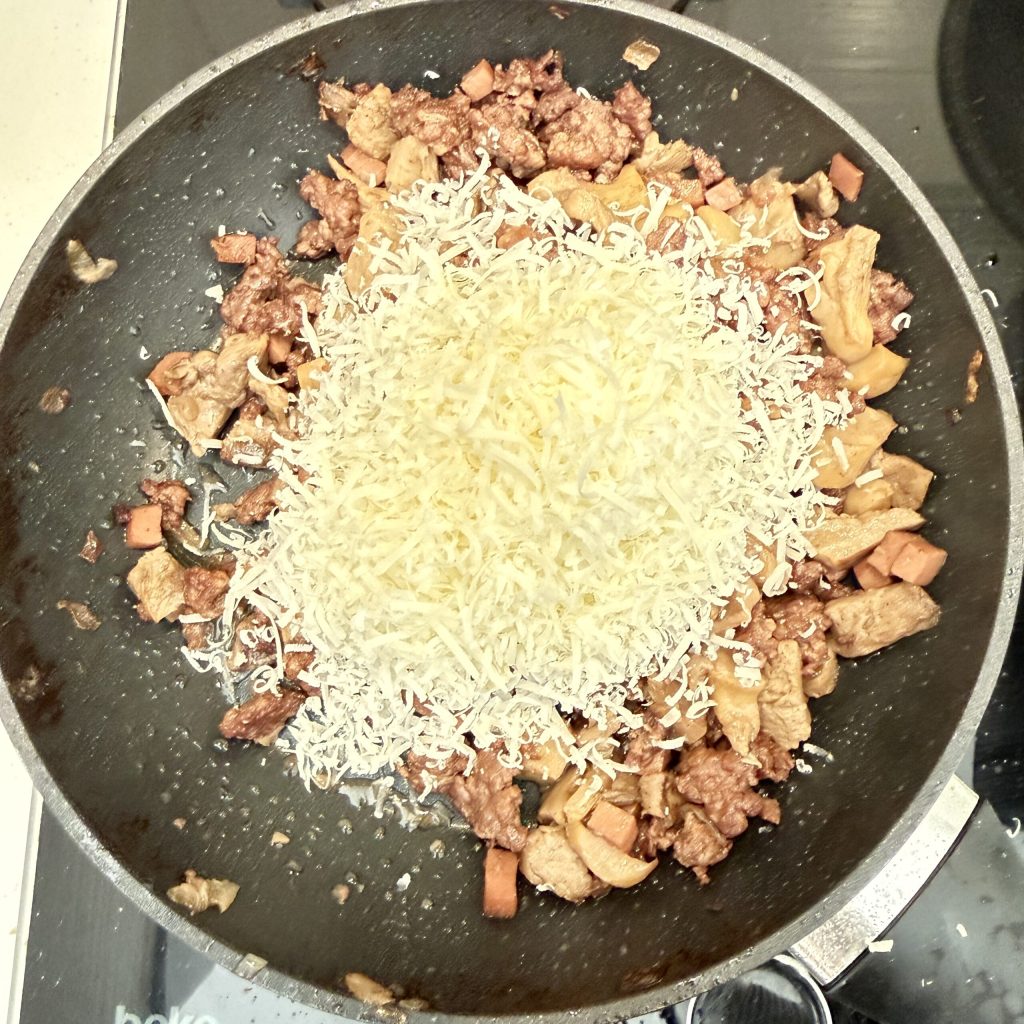 Als het afgekoeld is, kunt u de vulling direct in de pan afronden zonder andere kommen of containers vuil te maken. Voeg de geraspte kaas toe: u kunt kiezen of u Parmezaanse kaas wilt gebruiken of, voor een sterkere smaak, geraspte Pecorino Romano.