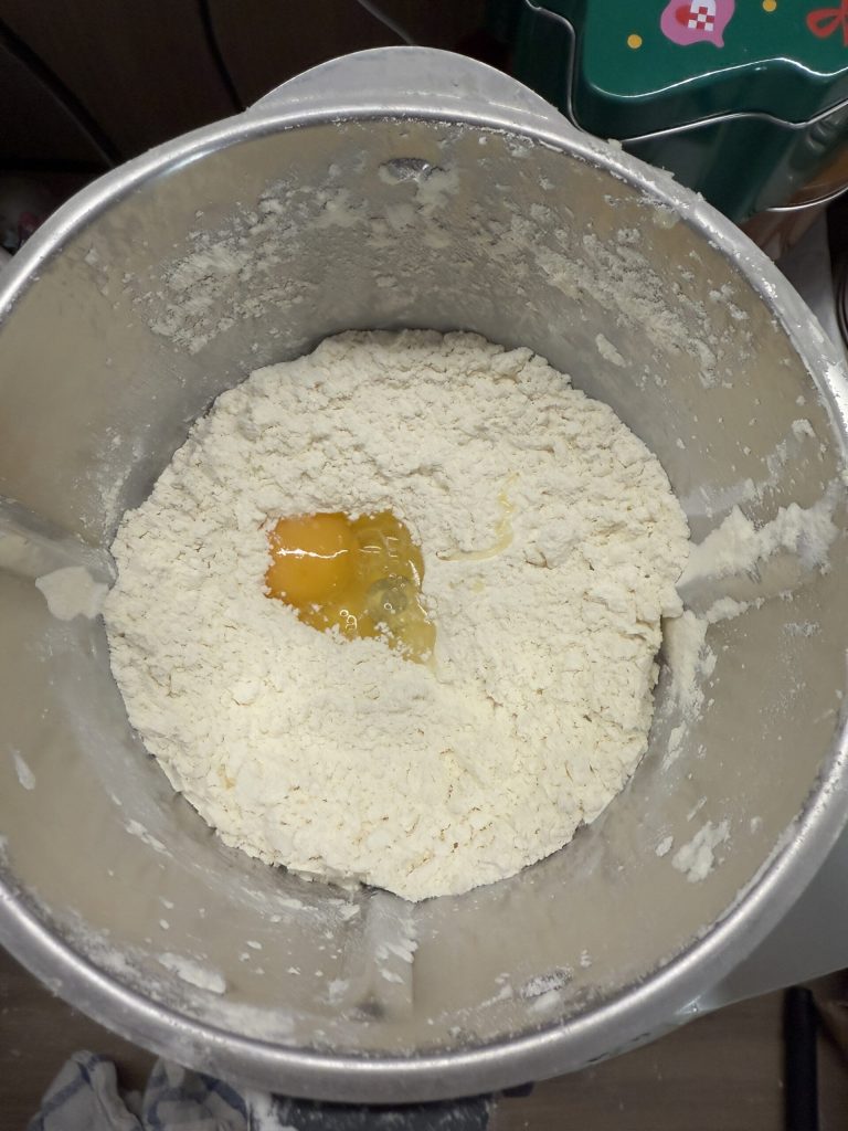 Voeg ook het ei toe en meng de ingrediënten. Breng het deeg dan over op een werkblad en maak het met je handen glad tot een gladde bal.