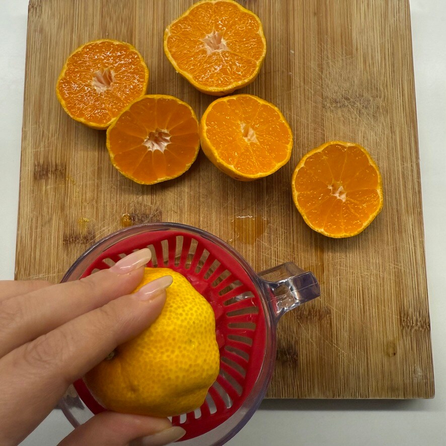 Voeg ook de geraspte schil van de mandarijnen toe (het is handig om deze te raspen voordat je ze perst) en het mandarijnensap.