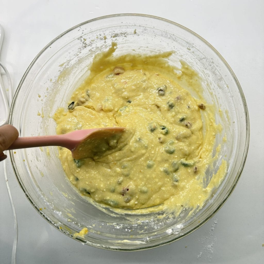 • Met een spatel en met bewegingen van onder naar boven, verdeelt u de rozijnen en het gekonfijte fruit gelijkmatig.