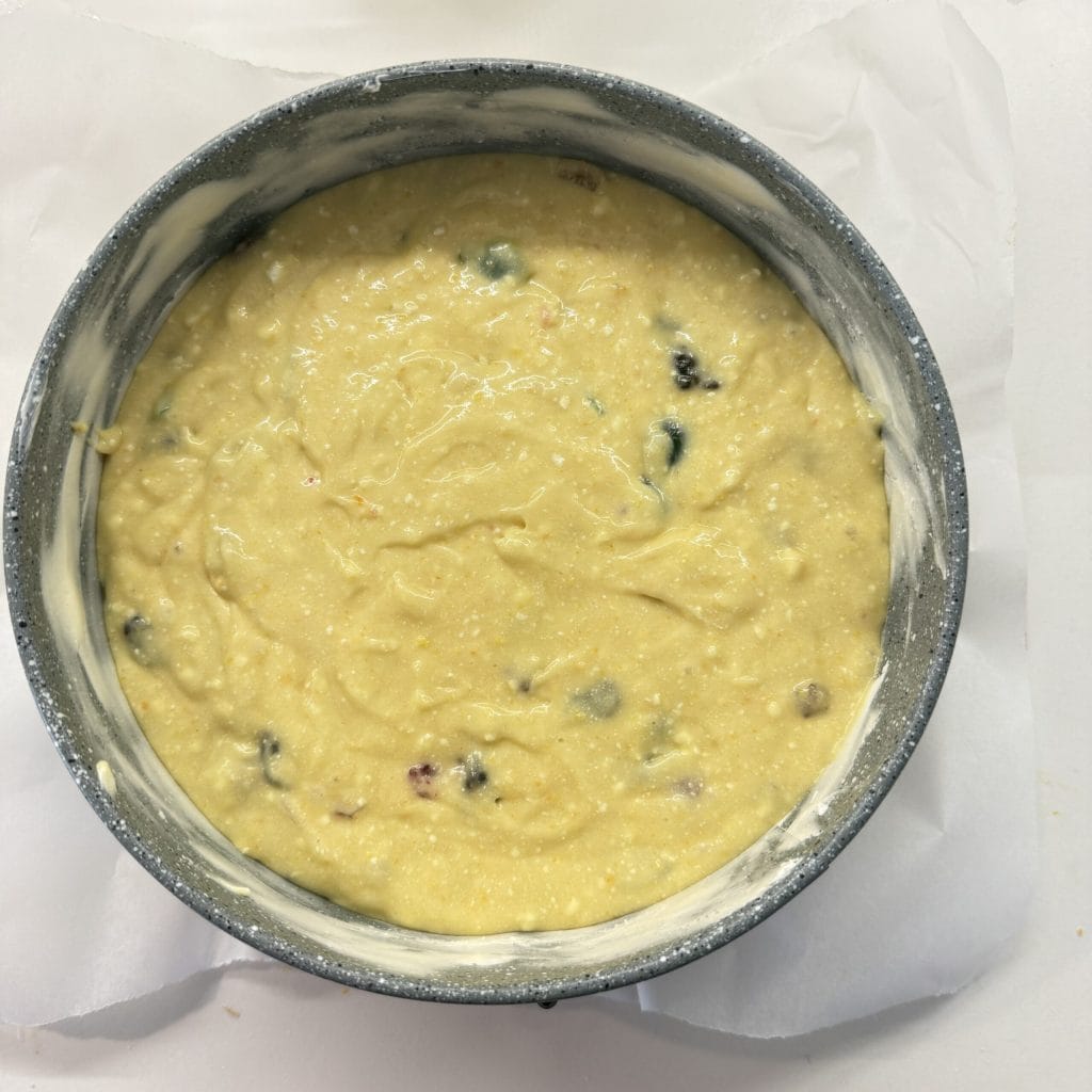 Bekleed een vorm van 20-22 cm met bakpapier en vet de randen in. Giet het panettone taart beslag erin, strijk de bovenkant glad met een spatel.