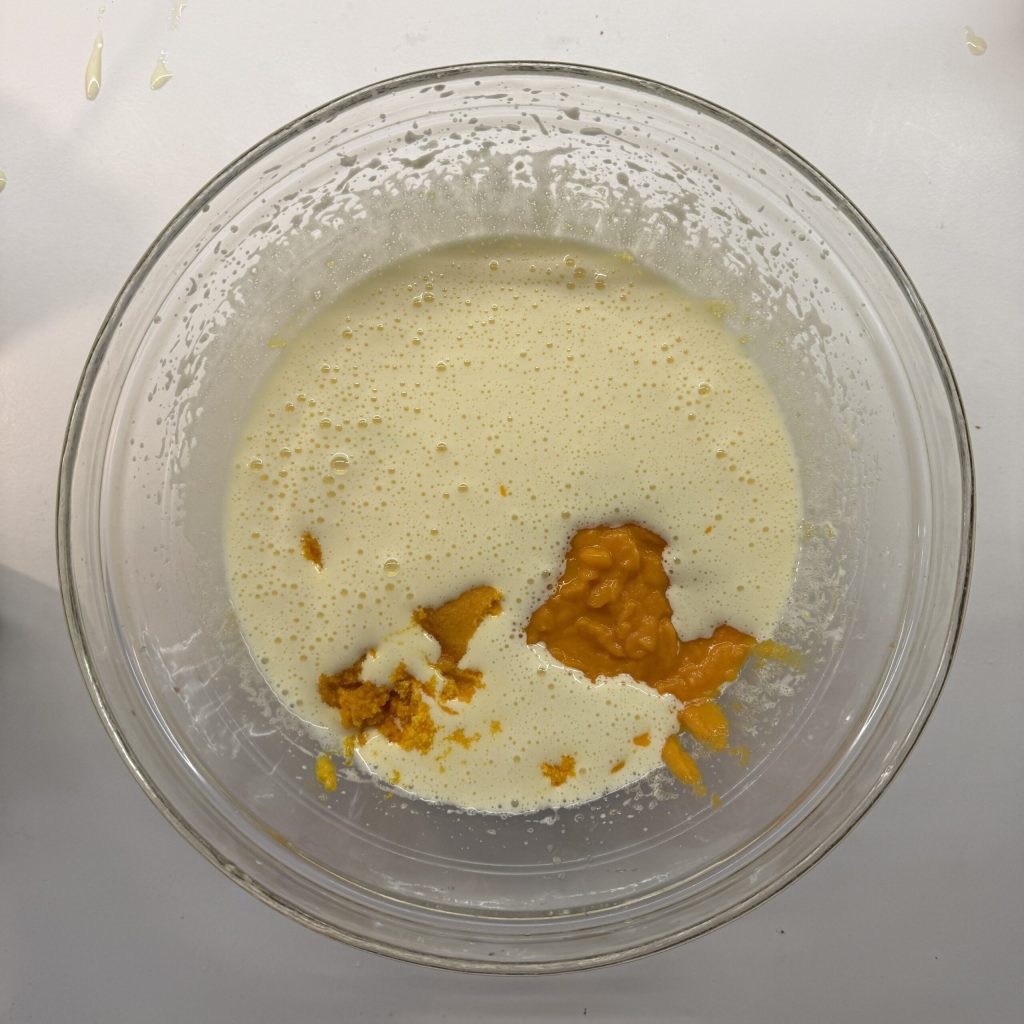Voeg de gekookte pompoen, de geraspte sinaasappelschil en het zakje vanilline toe.