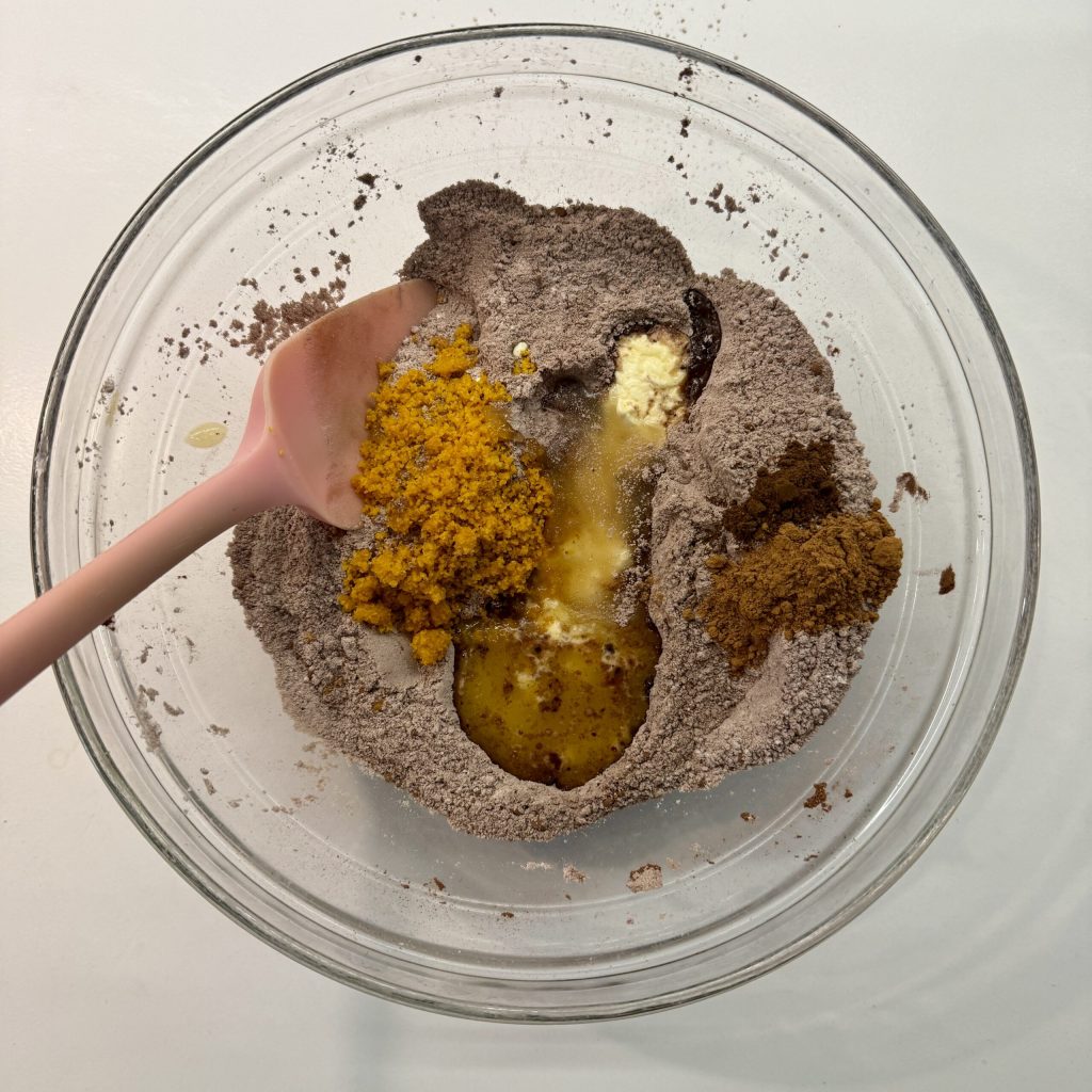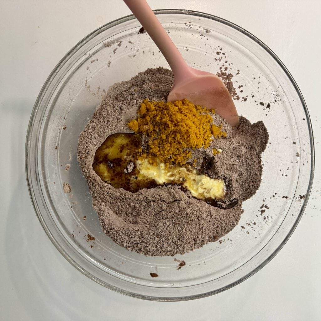 • Voeg de boter toe aan de kom met poeders. Rasp ook de schil van een sinaasappel en voeg deze toe aan de andere ingrediënten.