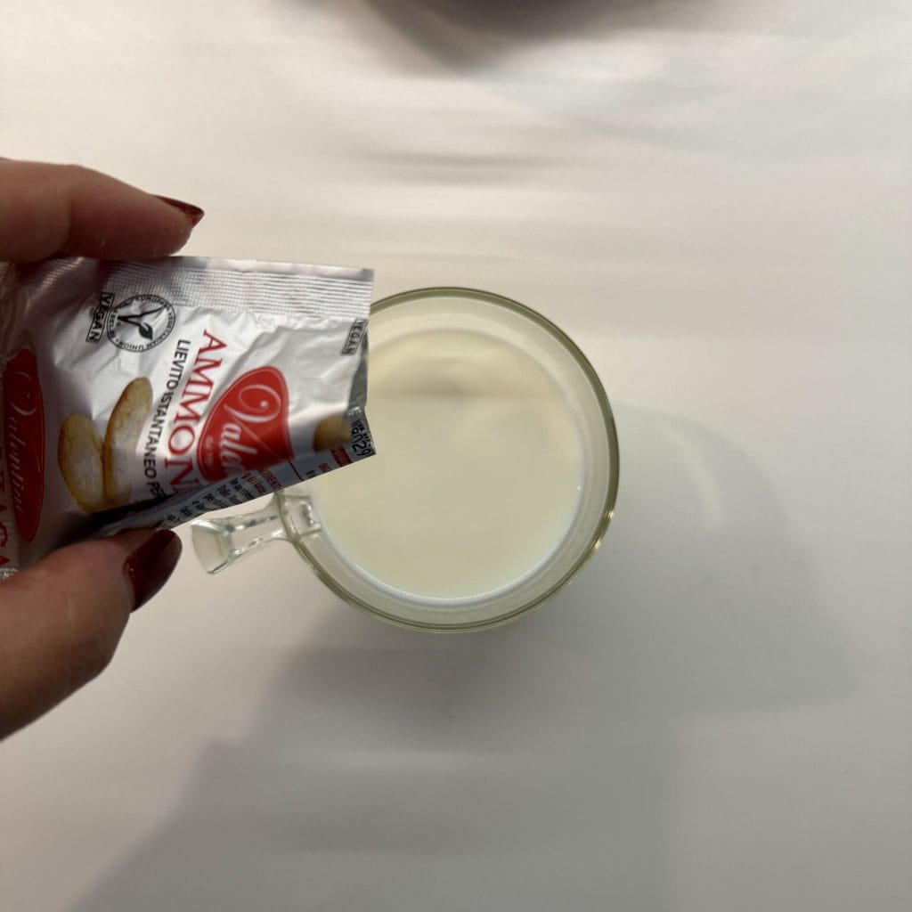 Doe de melk in een glas, verwarm het lichtjes in de magnetron. Los de ammoniak voor gebak op in de warme melk, roer met een lepel.