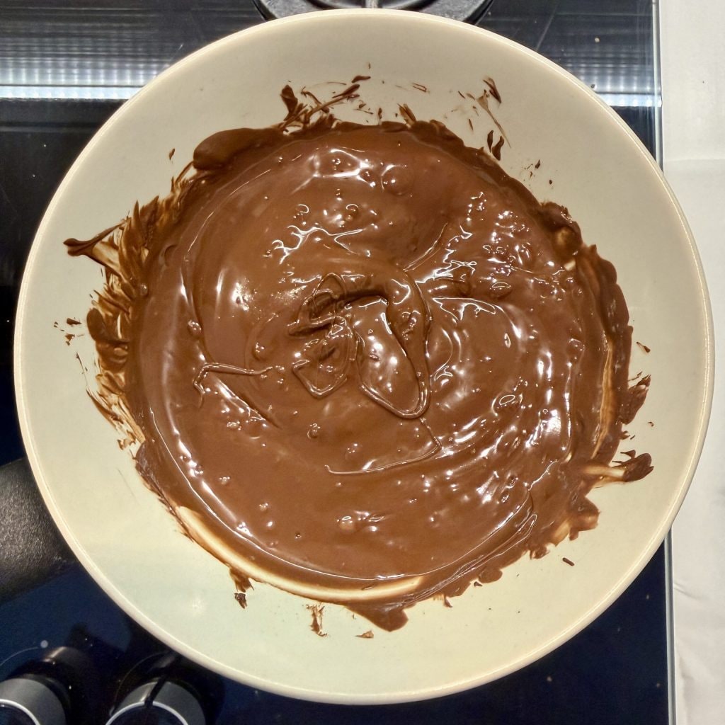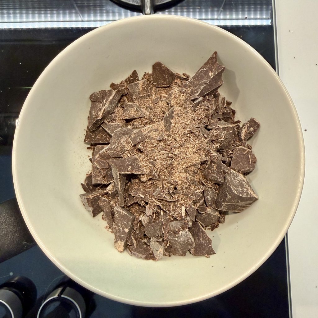 • Hak ondertussen de pure chocolade grof met een mes en doe deze in een niet te brede kom.