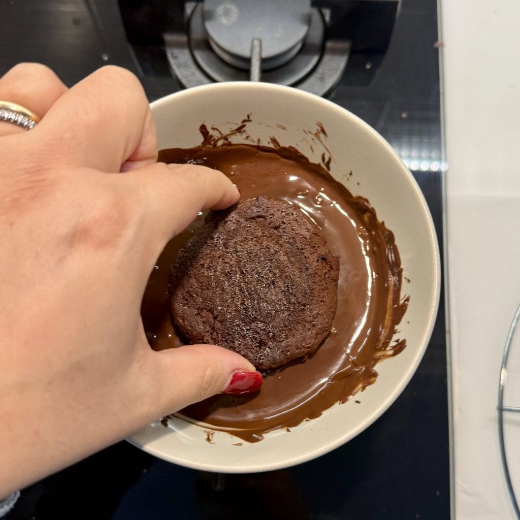 • Neem één koekje per keer en dompel de bovenkant in de gesmolten chocolade. Verwijder overtollige chocolade en plaats de geglazuurde Rame di Napoli op een koelrek voor gebak.