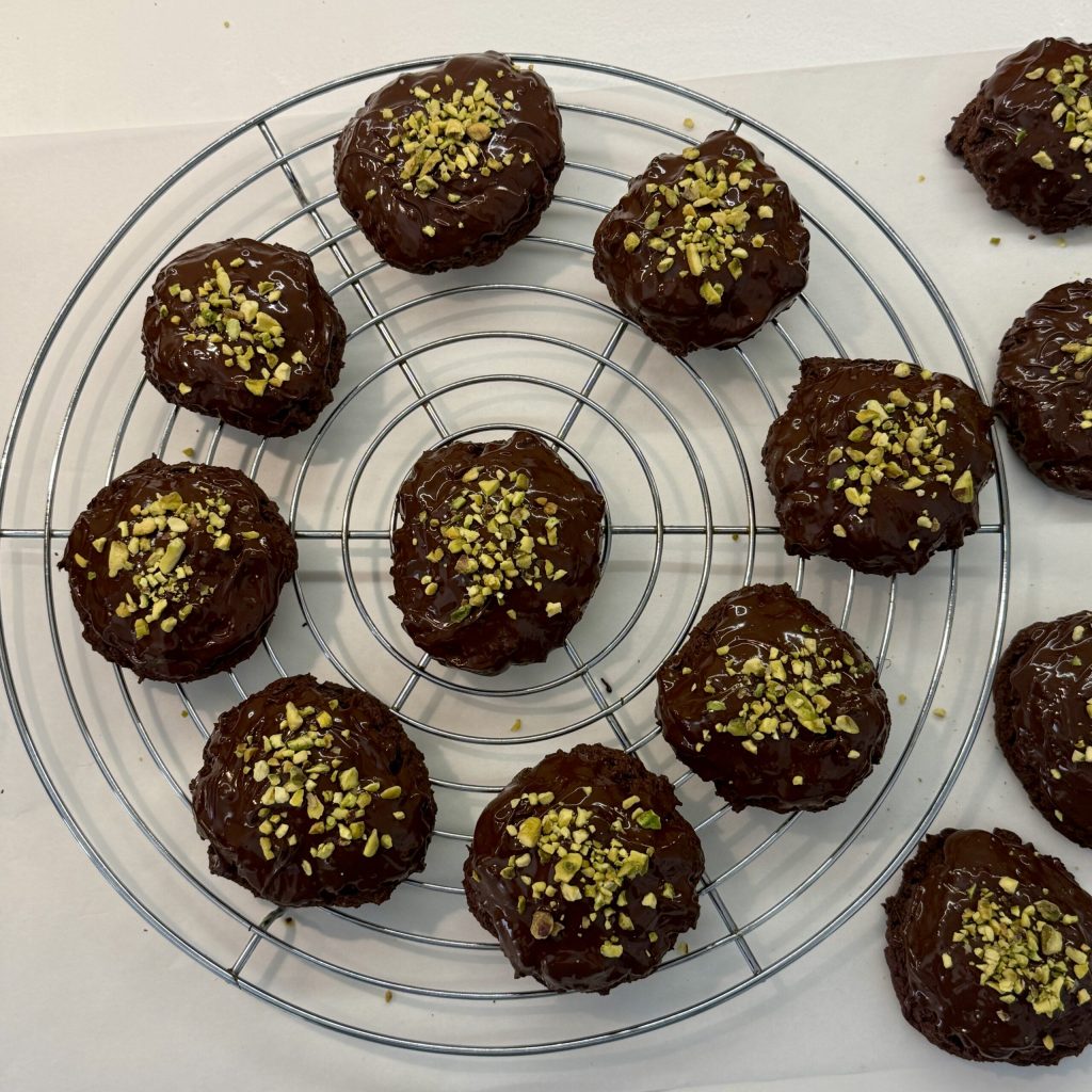 • Leg altijd een vel bakpapier onder het koelrek om overtollige chocolade op te vangen. Bestrooi de bovenkant met pistache stukjes. Laat de chocolade afkoelen en uitharden.