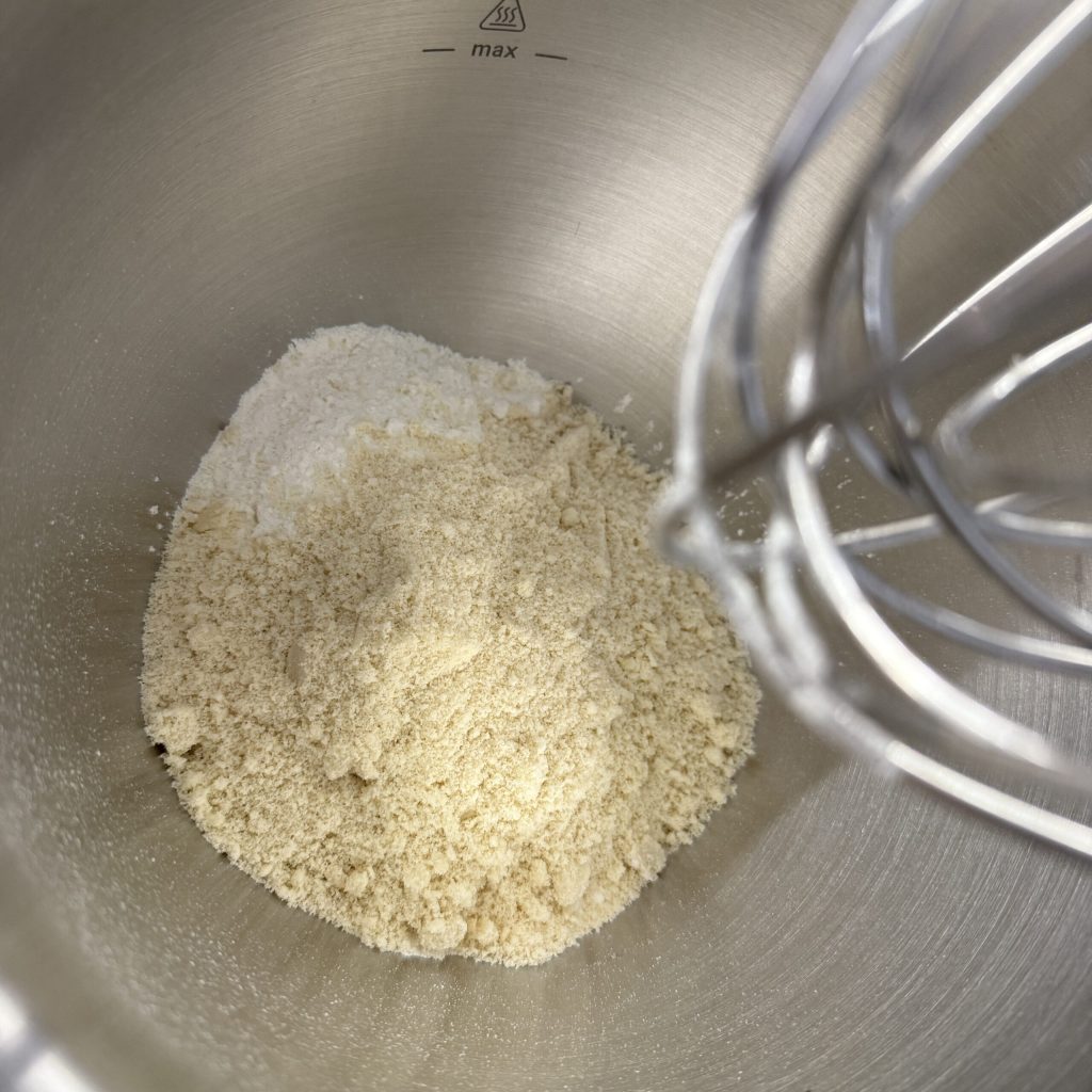 Doe de bloem, vanillepoedersuiker en fijngehakte amandelen (of amandelmeel) erbij.