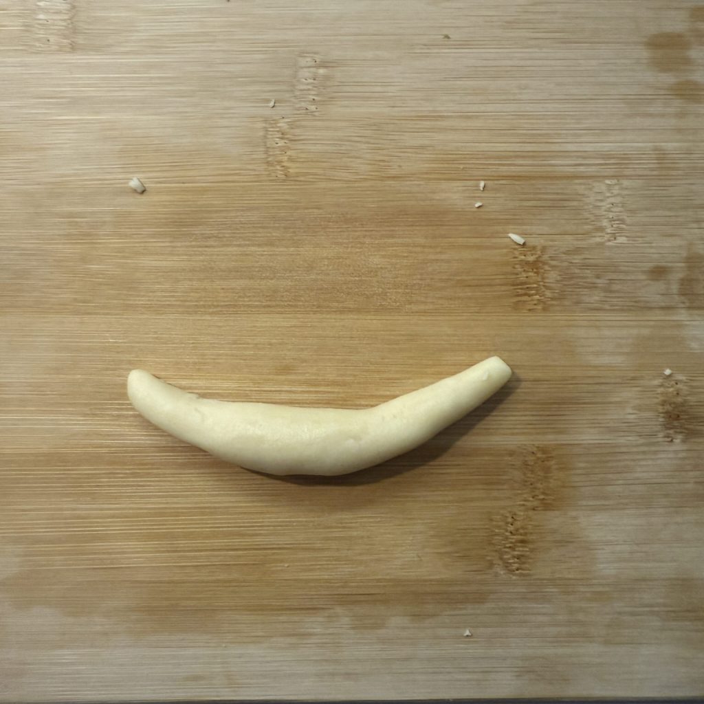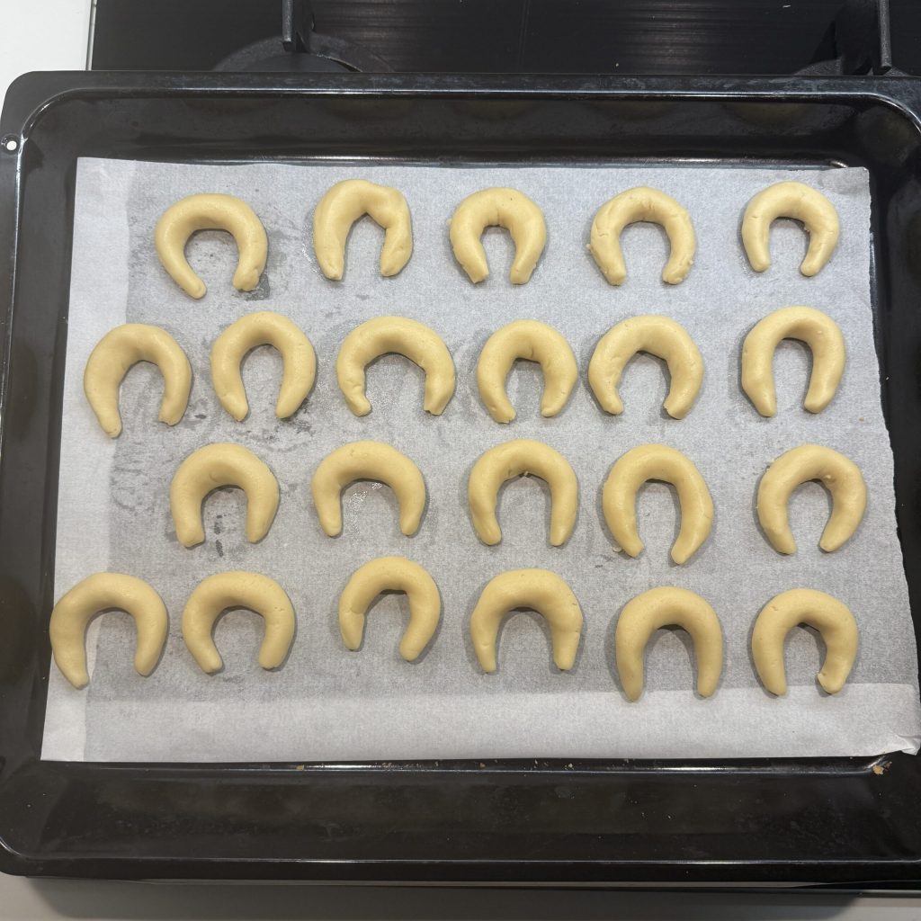 Buig vervolgens het cilindertje lichtjes, zodat je de traditionele halvemaanvorm van de Vanillekipferl krijgt.