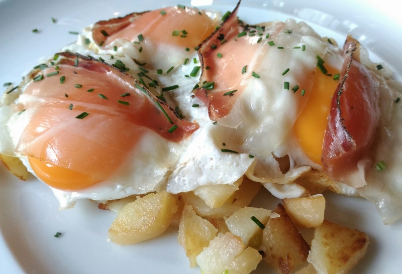De Aardappelen met ui, spek en eieren, (Roast kartoffeln mit spigelei) zijn een typisch gerecht uit de Duitse keuken, dat ook in Zuid-Tirol wordt gewaardeerd en bereid. Het is een eenvoudig te maken recept, smaakvol en zeer voedzaam. Beschouwd als een enkel gerecht, serveer ik het altijd met sneetjes brood met verschillende zaden. Het gebruikelijke advies dat ik u wil geven, is altijd om biologische producten te gebruiken, vooral als we snel te bereiden voedingsmiddelen consumeren, zoals eieren.