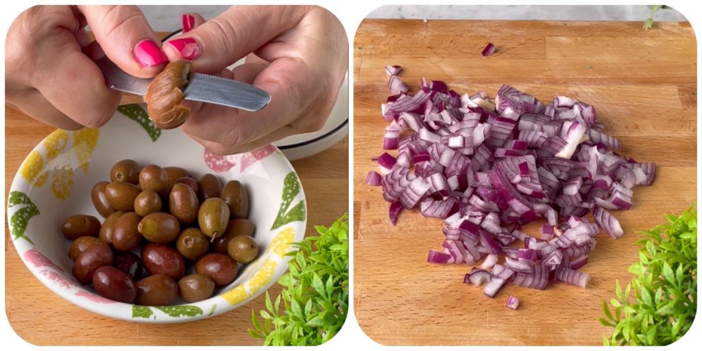 Snijd een ui in stukjes, bij voorkeur rood als je een zachtere smaak wilt. Ontpit de Gaeta olijven met een mesje, of gebruik een speciale ontpitter voor olijven.