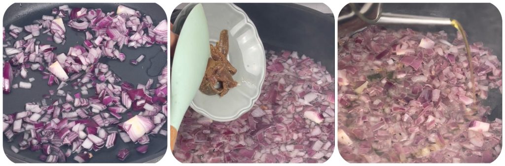 Doe in een koekenpan met anti-aanbaklaag het water, de stukjes ui en de ansjovis. Kook op middellaag vuur tot het water volledig is verdampt. Voeg dan de extra vergine olijfolie toe.